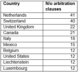 If we search for the term ‘arbitration’ in the IBFD tax treaties database, there are 219 results (caveat: not all of these references might be to ‘an arbitration clause’ as such, and some foreign-language treaties may have been missed). As the table below shows, arbitration clauses are of particular importance to jurisdictions whose treaty networks are used as part of tax planning strategies. By far the most arbitration clauses are in the treaty networks of the Netherlands and Switzerland, although the presence of Liechtenstein and Luxembourg in the top 10 list may also be indicative. At least two of the Swiss clauses, in its treaties with Peru and Argentina, are actually Most-Favoured Nation clauses triggered if the Latin American countries agree to binding arbitration with a third country. This suggests that, for Switzerland at least, arbitration clauses are important for its competitive position.
