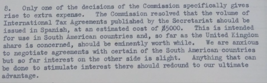 Of the second session, Morton observed that “the session was not very productive” but was keen to support anything that might allow the UK to conclude more tax treaties with developing countries. Everyone could agree to support information gathering and dissemination, and the translation of the secretariat’s compendium of international tax agreements into Spanish was something the British supported enthusiastically, keen as they were to obtain tax treaties with Latin American countries (more on that here).