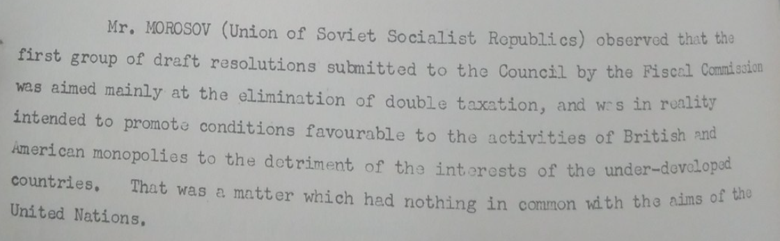 When the Commission’s work reached the ECOSOC, however, it appears that sentiment had changed. Morosov, the Russian participant (also its representative on the Commission itself) expressed his familiar objection that the Commission’s work on double taxation “was in reality intended to promote economic conditions favourable to the activities of British and American monopolies,” concluding that the Commission “was engaged in futile operations, and that it was therefore useless to keep it in existence.” According to his Polish counterpart, “the majority of the Commission had, by certain of the recommendations adopted by that body, tried to exploit the authority of the Economic and Social Council to relieve investors from the highly-industrialised capitalist countries of the taxation which those less highly developed countries were entitled to enforce.”