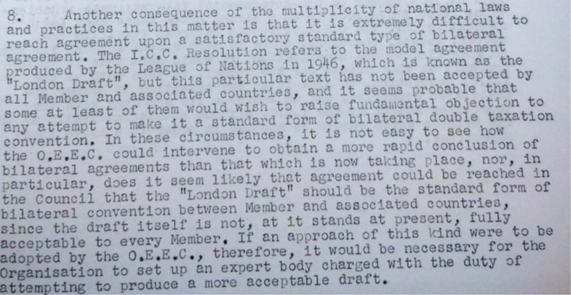 He also set out another surprising objection to the ICC’s proposal. It is often asserted that the OEEC picked up the League of Nations’ London draft model bilateral tax treaty, which favoured the interests of capital exporters, rather than the capital importer-favouring Mexico draft. While it is probably true that the eventual OECD model is closer to the London than the Mexico draft, the ICC’s proposal that the OEEC use the London draft was actually a problem for the OEEC, because not all of its member and associate countries had endorsed it. “If an approach of this kind were to be adopted by the OEEC, therefore,” concluded the Secretary General, “it would be necessary for the Organisation to set up an expert body charged with the duty of attempting to produce a more acceptable draft.”