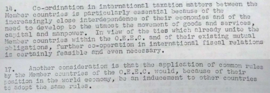 The most recent document in this particular file is an interim report from the Fiscal Committee in 1957. It shows how within 18 months the committee was already consolidating its ways of working (Working Parties on each specific issue, just as the OECD has today) and forming a clear raison d’être. In the excerpts below, I’ve picked out three things that struck me from the committee’s interim report. First, how forcefully it began to make the case for tax cooperation, as European economies became more integrated. Second, the recognition that other countries might be incentivised to follow Europe’s lead, because of its “placement in the world economy.” It is interesting to reflect on how much this echoes the EU’s tax cooperation efforts today, perhaps more so than the OECD, for which the economic power of its members complicates its authority.