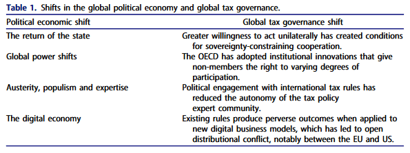 As the new academic year gets underway, it’s time for me to promote a review piece that Rasmus Christensen and I published over the summer. We provide a framing of current developments in global tax governance from a political economy perspective. The piece is written at introductory level and fills the gap for an overview reading in university courses. It is framed as a review of four interdisciplinary books, all of which we recommend. Oh and it’s open access, thanks to EU funding!